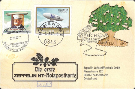Holzpostkarte, mit Zeppelin NT D-LZZF "Baden-Württemberg" am 05.08.2017, Hohenems A - Friedrichshafen D